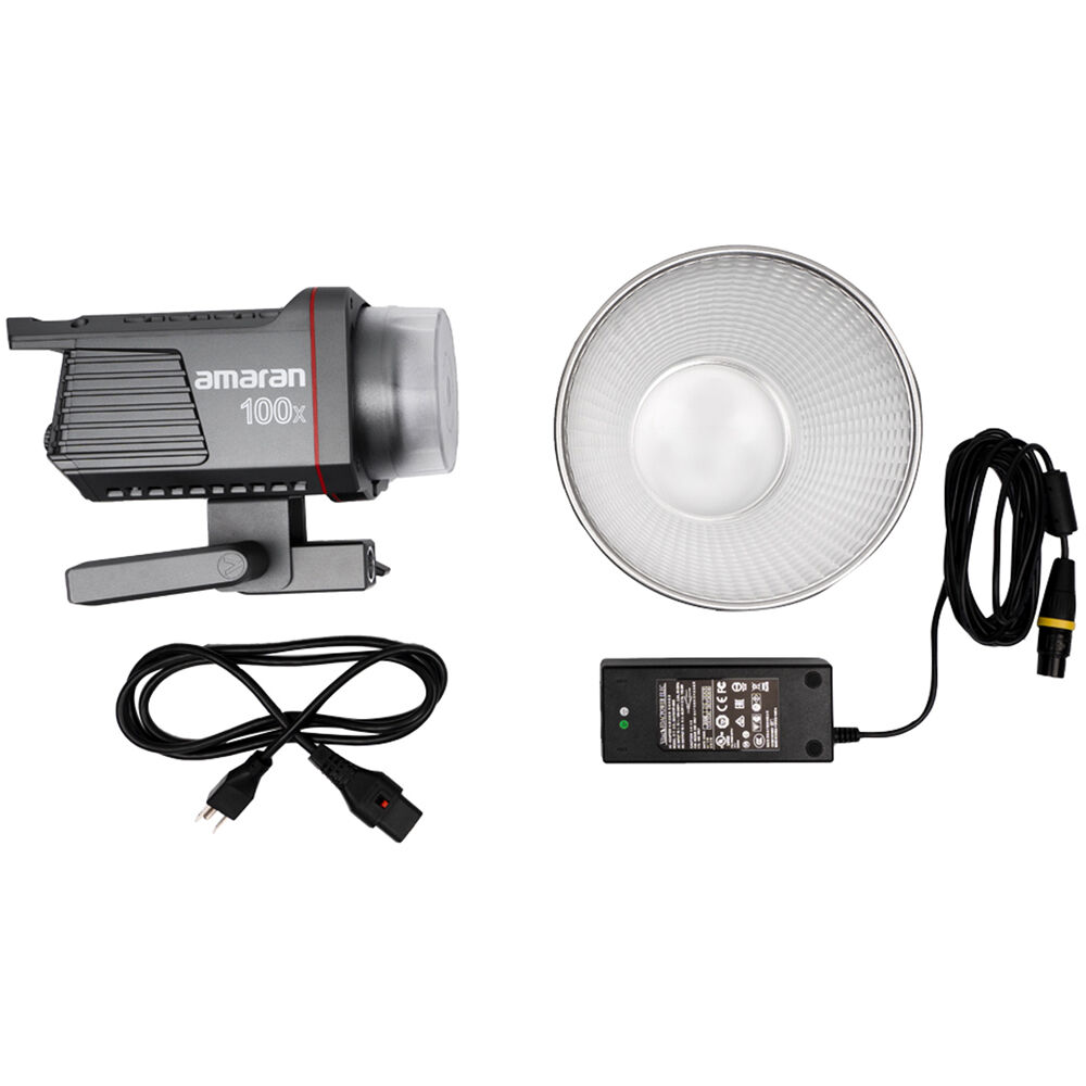 Для монтажу світлових аксесуарів та модифікаторів на цьому приладі студійного світла є кріплення для фотозонту та кріплення відбивача Bowens-S. Варіанти живлення світлодіодного прожектора Amaran 100х: стаціонарно від мережі через адаптер, розрахований на напругу 100-240 В і автономно – від акумуляторних батарей.